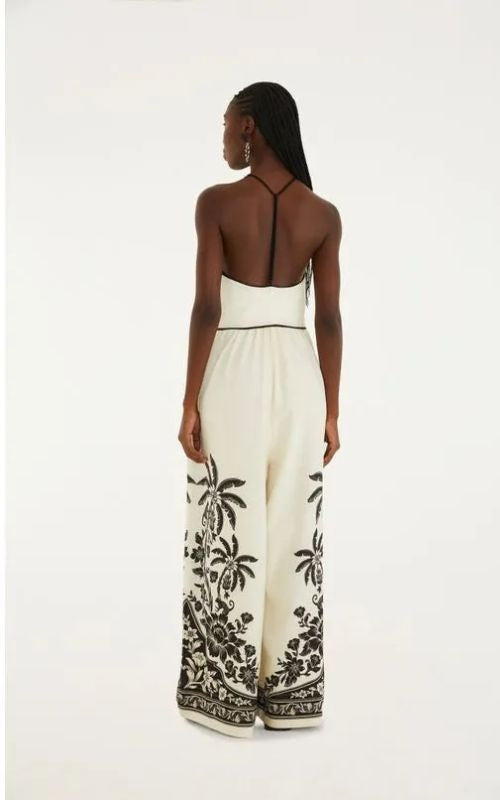 Printed wide-leg jumpsuit in the Guanacaste pattern. Features a halter neckline that highlights the décolletage, with a sleeveless design that flatters the shoulders. The waist is subtly defined while the wide legs provide movement and fluidity.