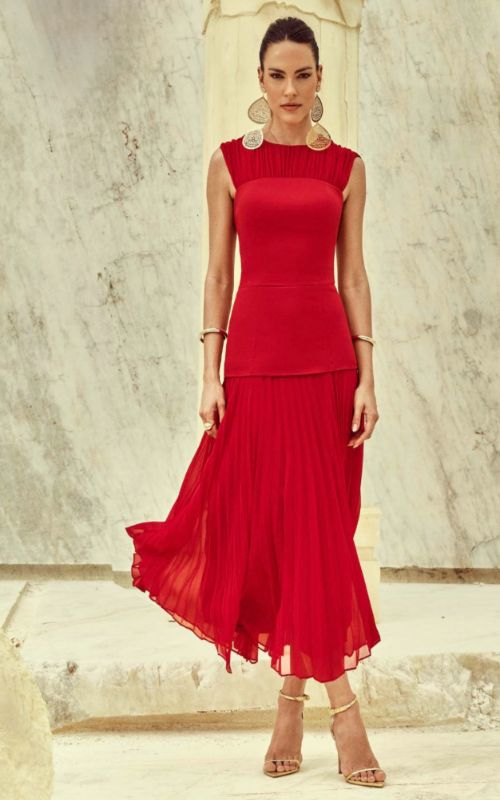 This dress features a midi length, draped bust, and a pleated, flowing skirt. The round neckline and back zipper closure are details that elevate the piece, making it perfect for various occasions, from a cocktail party to a more formal dinner.